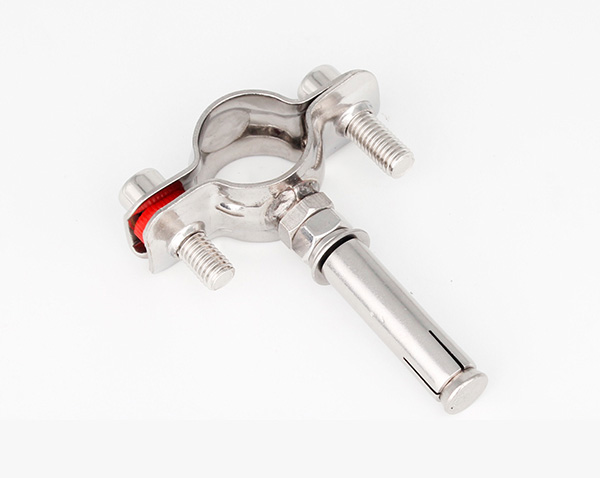 衛生級管支架最常見是由:兩個半圓不銹鋼片、兩個螺栓、一個墊圈(常見為紅色)、一個支撐的鋼管組合而成,這種組合管支架比較美觀,連接方式可為螺紋和焊接兩種。